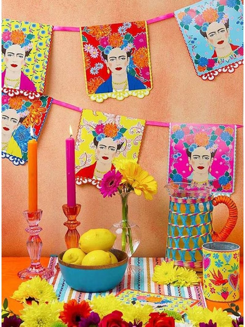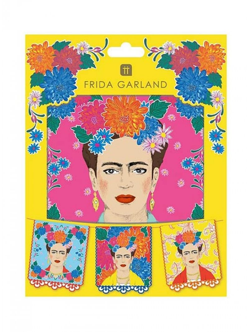 Χάρτινη γιρλάντα διπλής όψης της σειράς Boho Frida με την Frida Kahlo σε σημαιάκια διαφόρων χρωμάτων.