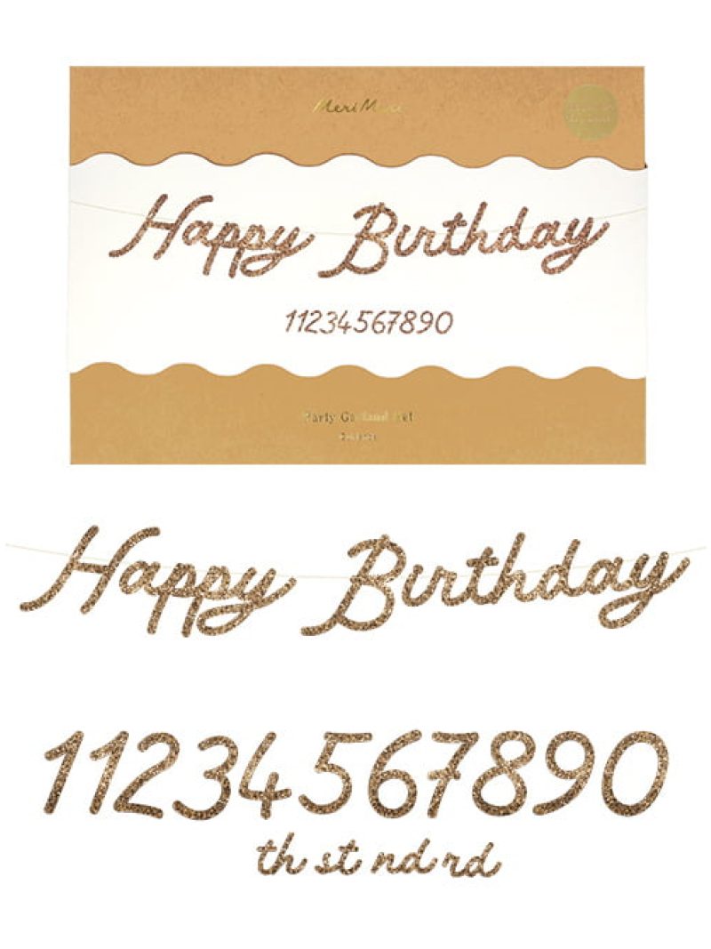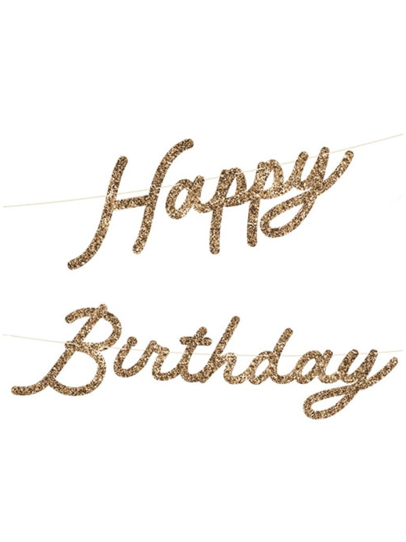 Χάρτινη γιρλάντα με “Happy Birthday” σε χρυσή glitter απόχρωση, περασμένο σε ασορτί κορδόνι.