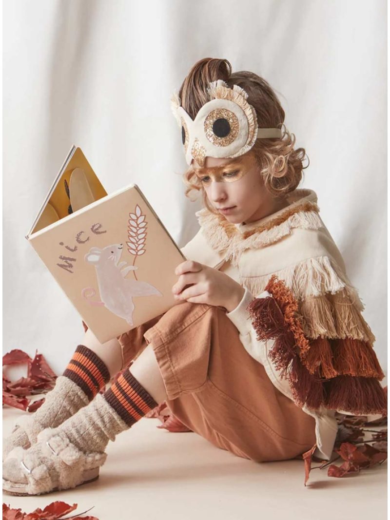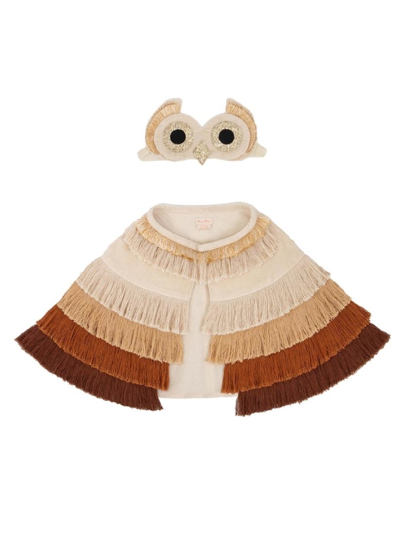 Η κάπα διαθέτει κρόσσια εκρού, μπεζ και καφέ αποχρώσεων και συνοδεύεται από αντίστοιχο καπέλο με λάστιχο με τη μορφή κουκουβάγιας.