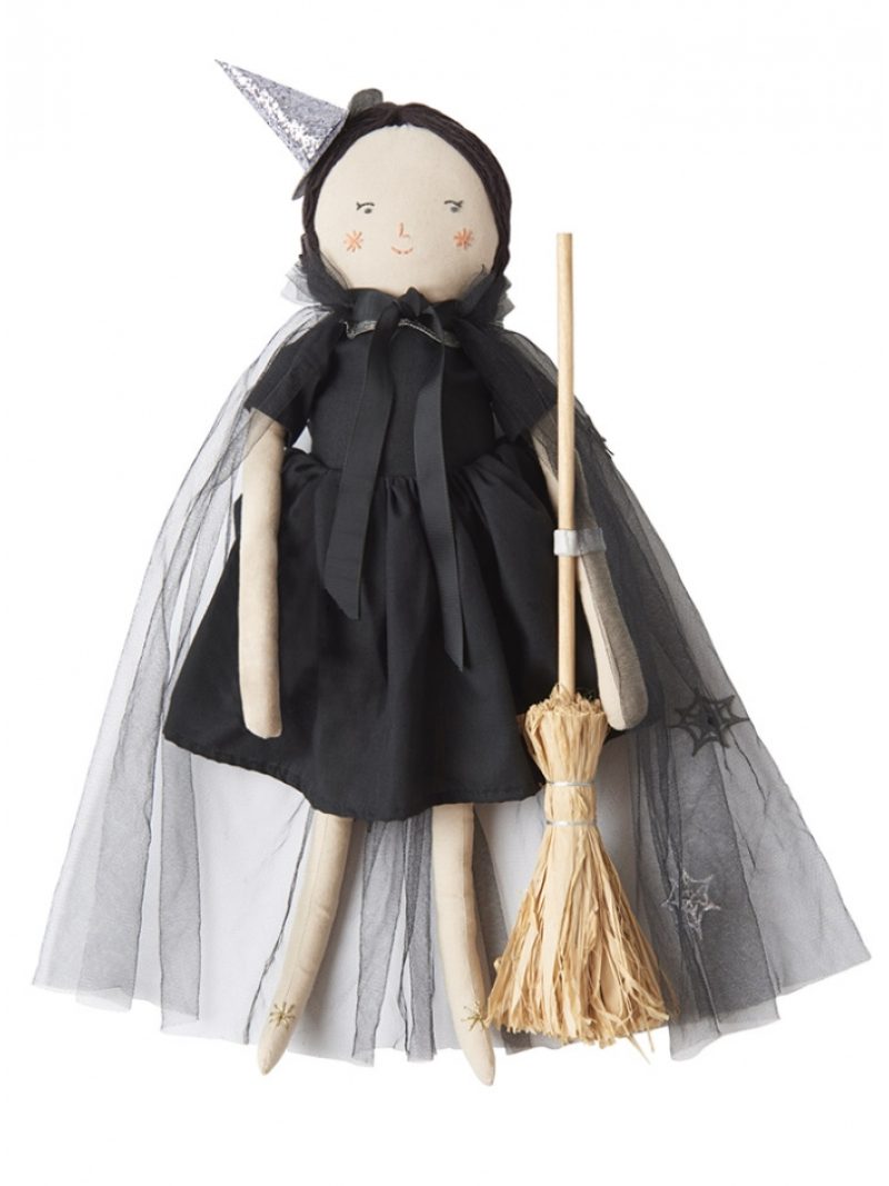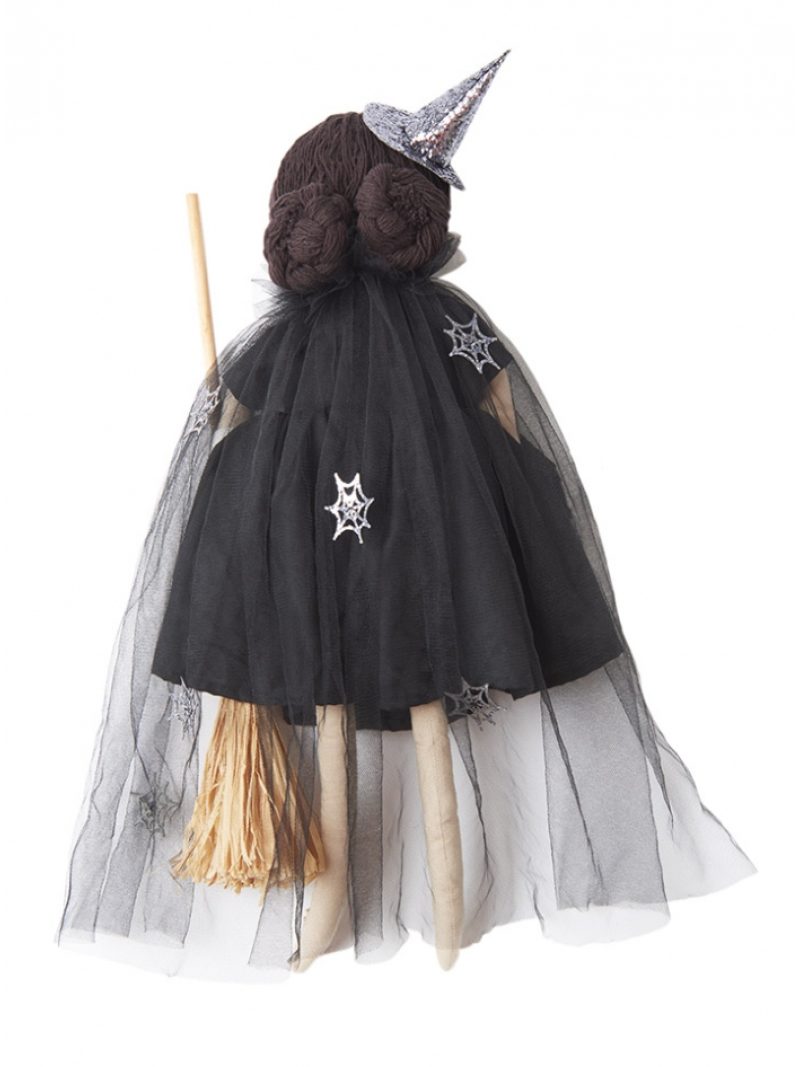 Αυτή η υφασμάτινη κούκλα με τα πλεκτά μαύρα μαλλιά φορά μαύρο φόρεμα με κεντητές ασημένιες λεπτομέρειες σε σχήμα ιστού αράχνης και λευκό τούλι, κρατά σκουπόξυλο και το κεφάλι διακοσμείται με ασημένιο καπελάκι μάγισσας.