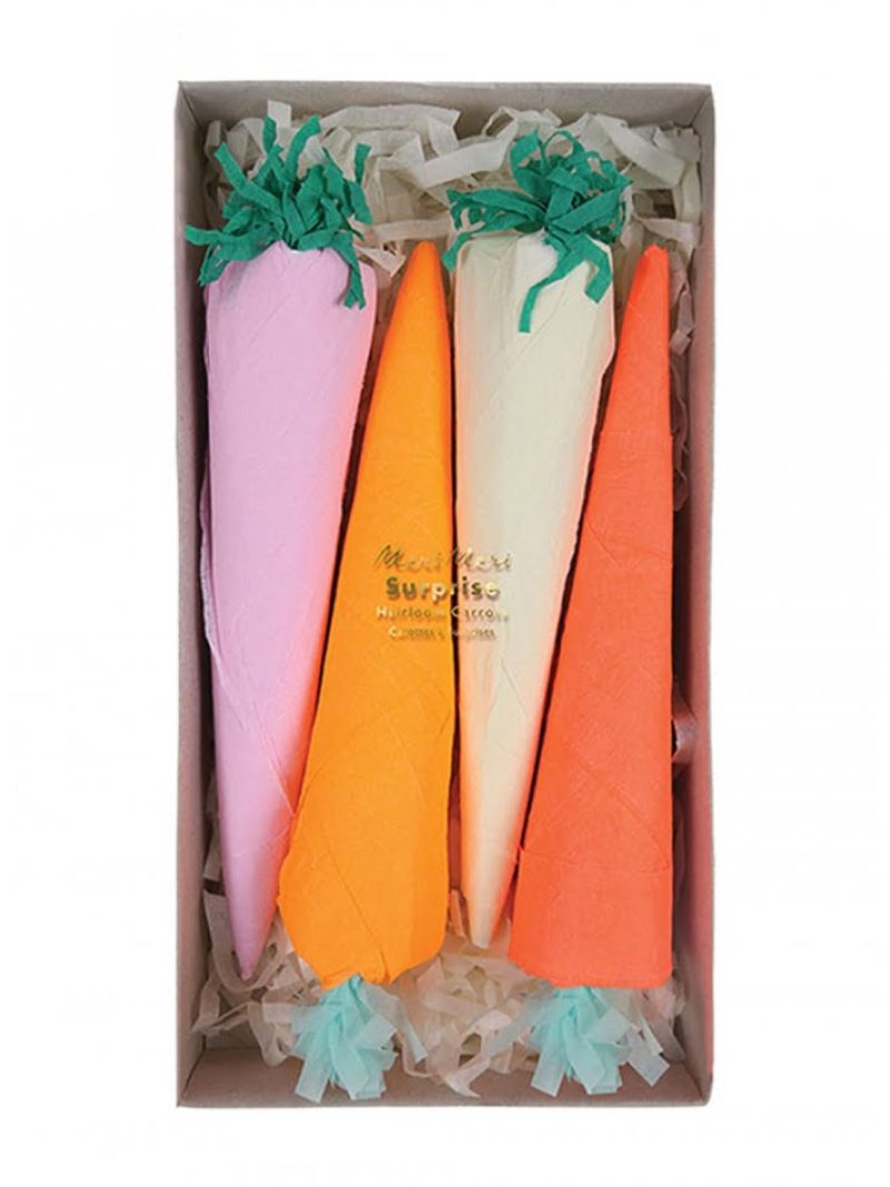 Χάρτινα δωράκια έκπληξη σε σχήμα καρότου σε τέσσερις διαφορετικές αποχρώσεις.